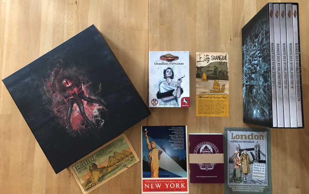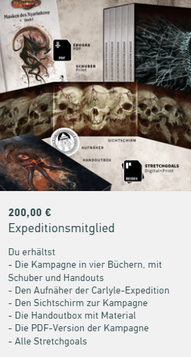 Im April 2021 sind wir auf das Crowd-Funding für die Masken des Nyarlathotep gestoßen. Wir hatten dazu damals hier auf der Homepage darüber berichtet und auch ein wenig Werbung dafür gemacht, damit das Projekt auch maximal unterstützt und erfolgreich wird. Auch wir hatten uns dazu entschlossen, da wir die Welt um den Cthulhu-Mythos sehr mögen, dieses Crowd-Funding selbst zu unterstützen. Letztendlich haben wir uns für die „Expeditionsmitglied“ Version entschieden. Diese Version umfasst das Vollständige Paket und unterscheidet sich zur „Expeditionsleiter“ Version nur darin, dass die Bände nicht in Echtleder gebunden sind, was auch nicht zu unseren Restlichen Büchern von Call of Cthulhu gepasst hätte.
