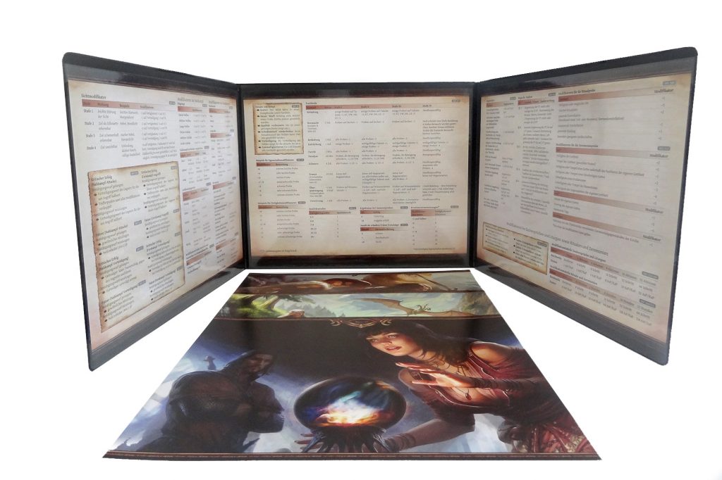 Der Universal-Spielleiterschirm bietet auf drei horizontal angelegten Elementen sowohl auf der Vorder-, wie auch auf der Rückseite transparente Fächer für eure Spielunterlagen. Der Schirm wird mit sechs passenden DSA5-Einlagen im Letter-Format geliefert, mit allen wichtigen Tabellen, die den Meister beim Leiten eines Abenteuers unterstützen. Auf den insgesamt drei Innenseiten des Schirms sind wichtige Angaben zu Talenteinsatz, Kampf, Magie und Götterwirken übersichtlich zusammengefasst, sodass mühseliges Suchen in Büchern der Vergangenheit angehört. Weitere Einleger, auch für weitere Spielreihen, können via „http://www.ulisses-ebooks.de“ erworben werden