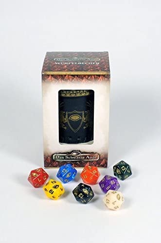Formschöner Würfelbecher mit acht farbigen W20, deren Farbe an die Werte Farmen der Charaktere angelehnt sind. Dadurch können die Proben Problemlos direkt gewürfelt werden und anhand der Farben den Attributen zugeordnet werden.