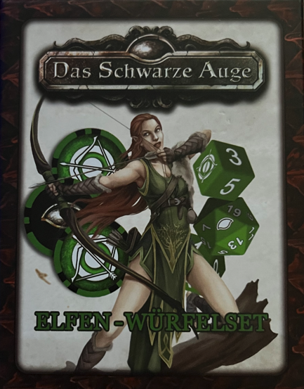 Das Elfen-Würfelset enthält drei zwanzigseitige und zwei sechsseitige Würfel, die du zum Spielen von „Das Schwarze Auge“ verwenden kannst. Einer der zwanzigseitigen Würfel ist in Grün gehalten, ein Würfel ist weiß und einer schwarz. Die sechsseitigen Würfel zeigen statt der Zahl 6 ein Elfen-Symbol.