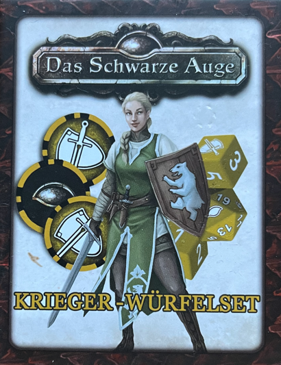 Das Krieger-Würfelset enthält drei zwanzigseitige und zwei sechsseitige Würfel, die du zum Spielen von Das Schwarze Auge“ verwenden kannst. Einer der zwanzigseitigen Würfel ist in Gelb gehalten, ein Würfel ist weiß und einer schwarz. Die sechsseitigen Würfel zeigen statt der Zahl 6 ein Krieger-Symbol.