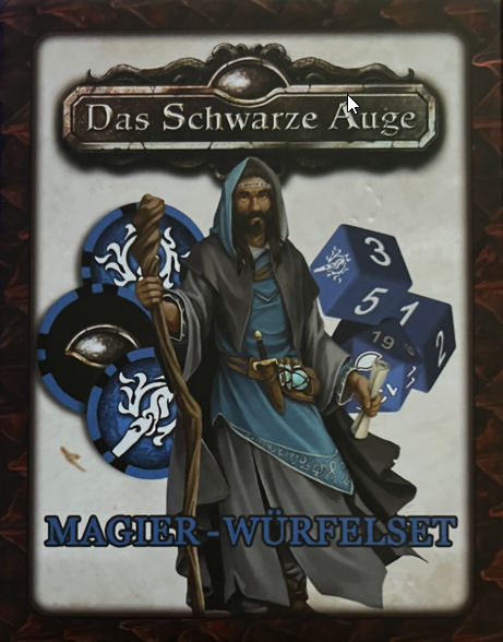 Das Magier-Würfelset enthält drei zwanzigseitige und zwei sechsseitige Würfel, die du zum Spielen von DasSchwarze Auge“ verwenden kannst. Einer der zwansigseitigen Würfel ist in Blau gehalten, ein Würfel ist weiß und einer schwarz. Die sechsseitigen Würfel zeigen statt der Zahl 6 ein Magier-Symbol.