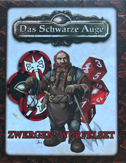 Das Zwergen-Würfelset enthält drei zwanzigseitige und zwei sechsseitige Würfel, die du zum Spielen von „Das Schwarze Auge“ verwenden kannst. Einer der zwanzigseitigen Würfel ist in Rot gehalten, ein Würfel ist weiß und einer schwarz. Die sechsseitigen Würfel zeigen statt der Zahl 6 ein Zwergen-Symbol.